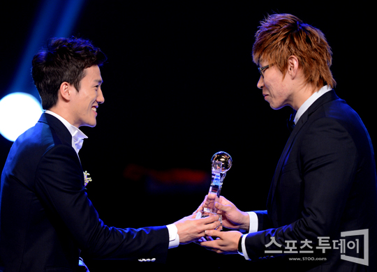 [스포츠투데이 정재훈 기자] 9일 오후 양재동 교육문화회관 대극장에서 '2011~2012 KB 국민카드 프로농구 시상식이 열렸다. 박찬희가 오세근에게 신인상 트로피를 건네고 있다.스포츠투데이 정재훈 사진기자 roze@<ⓒ아시아경제 & 재밌는 뉴스, 즐거운 하루 "스포츠투데이(stoo.com)">