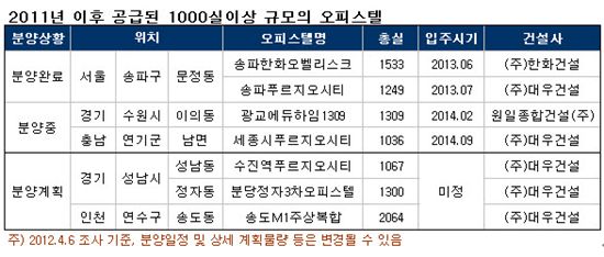 [아시아경제 배경환 기자] 신도시나 택지개발지구에 1000실 이상 매머드급 오피스텔 공급이 증가하고 있다. 하지만 실내 면적의 경우 1~2인 가구에 맞춘 전용면적 40㎡미만의 초소형 비중도 같이 늘고 있는 추세다.10일 부동산정보업체 부동산114에 따르면 2012년 현재까지 입주를 마친 1000실 이상의 대규모 오피스텔은 전국 총 13곳이다. 1990년대 후반에 2곳, 2001~2005년까지 11곳이 공급됐다. 2005년 이후 5년간은 1000실 이상의 대규모 오피스텔 공급을 찾기 힘들었다. 하지만 지난해부터 신도시나 택지지구 주변에 매머드급 오피스텔 단지의 공급이 눈에 띄고 있다. 현재 공사 중인 곳만 4곳으로 앞으로 3개 단지가 연내 분양한다.이중 송도국제도시와 성남 일대가 대표적인 사업지로 꼽힌다. 송도의 경우 최근 롯데, 이랜드 등의 투자유치로 대형복합시설이 들어설 예정인데다 삼성바이오로직스, 동아제약 등이 입주해 배후인구 유입도 예상된다. 경기 성남 지역은 판교 테크노밸리를 중심으로 기업 이주가 지속되고 2016년에는 신분당선이 광교신도시까지 연장돼 기대감을 높이고 있다.송도에서는 송도M1 주상복합오피스텔 2064실이 예정됐다. 성남에는 1000실이 넘는 대규모 단지가 순차적으로 모습을 드러낸다. 정자동 분당정자3차 오피스텔(1300실), 성남동 수진역푸르지오시티(1067실) 등이 연내 공급된다. 성남 분당구 일대에는 이미 분당인텔리지2(1127실), 동양파라곤(1113실), 대림아크로텔(1035실), 풍림아이원플러스(1968실) 등이 자리잡고 있어 향후 1000실 이상 매머드급 오피스텔이 9곳이나 형성된다. 하지만 1000실이 넘는 대규모 단지의 경우 세대별 면적은 예전보다 작아지는 것으로 조사됐다. 2000년 이전에 공급한 대규모 오피스텔의 경우 전용면적 40㎡이하가 3%에 불과했다. 하지만 2001~2005년 분양한 단지들은 40㎡이하가 46%로 늘었다. 2011년 이후 분양한 오피스텔은 40㎡이하 초소형 세대 비중이 80%까지 크게 증가했다. 1~2인 가구 증가에 따라 달라진 수요층을 끌어들이기 위한 전략이다. 올해 공급된 세종시푸르지오시티는 단지내 세대 95% 이상을 40㎡이하 초소형으로 구성했다. 2011년 공급된 문정지구 송파푸르지오시티도 40㎡이하가 94% 이상을 차지한다. 같은 지역에 분양한 송파한화오벨리스크 역시 92%가 40㎡이하다.조성근 부동산114리서치센터 연구원은 “신도시나 택지지구에 공급되는 대규모 오피스텔의 경우 그동안 좋은 분양성적을 유지했다”며 “최근에는 1~2인 가구 증가 추세를 반영해 소형 면적 비중을 크게 늘리면서 청약경쟁률이 높았던 만큼 실수요자는 물론 투자자들도 연내 예정물량에 관심을 가져볼만 하다”고 언급했다.