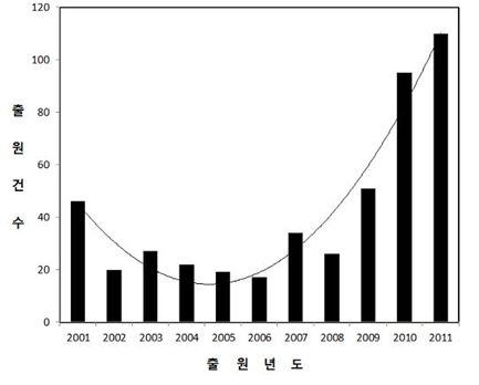 2001~2011년 연도별 전자책 특허출원건수 비교그래프