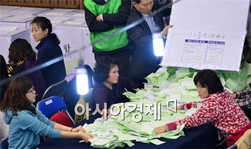 [아시아경제 양지웅 기자] 제19대 국회의원 선거 투표가 종료된 11일 서울 영등포 개표소가 마련된 여의도 고등학교에서 개표사무원들이 투표용지를 분류하고 있다.양지웅 기자 yangdoo@<ⓒ세계를 보는 창 경제를 보는 눈, 아시아경제(www.asiae.co.kr) 무단전재 배포금지>
