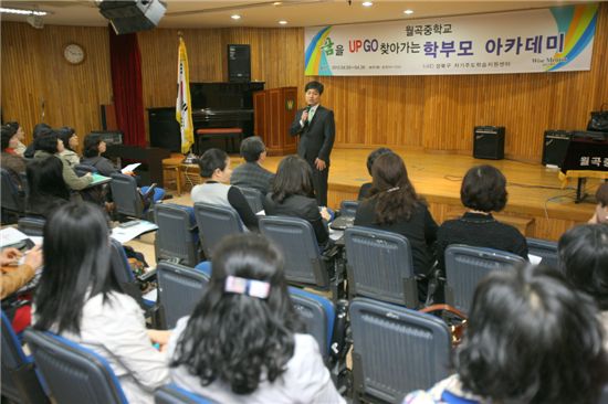 김영배 성북구청장이 12일 오전 월곡중학교 미래창조관에서 열린 ‘꿈을 UP GO 찾아가는 학부모 아카데미’에서 인사말을 하고 있다.<br />