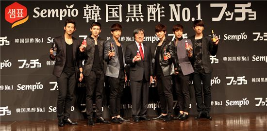 60년 발효명가 샘표가 건강발효흑초 '백년동안'의 일본 광고모델로 2PM을 선정하고 본격적인 일본 식초음료시장 진출을 선언했다. 박진선 샘표 대표(가운데)와 2PM이 기자간담회 후 기념촬영을 하고 있다.