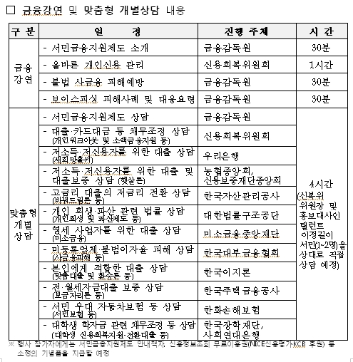 [아시아경제 김현정 기자] 금융감독원이 신용회복위원회와 공동으로 '맞춤형 서민금융상담 행사'를 개최한다고 13일 밝혔다.오는 26일 우리은행 본점 4층 강당에서 열리는 이번 행사에는 이종휘 신용회복위원회 위원장, 신복위 홍보대사인 탤런트 이정길 등이 참석해 서민들과 1대1 개별상담을 실시한다. 금감원은 이를 통해 서민들의 금융애로 및 의문사항을 밀착상담하고 구체적인 해결책을 제시해 준다는 방침이다. 이번 행사에서 한국장학재단 및 사회연대은행은 처음으로 대학생 학자금 대출과 관련해 개별상담을 실시할 예정이다. 이밖에 금감원과 신복위 등 관계자는 서민금융제도 안내 및 신용관리 방법, 불법 사금융 대응 요령, 보이스피싱 피해금 반환 방법 등을 강연한다. 참가자들은 우리은행 및 한국이지론을 통해 새희망홀씨 등에 대한 대출가능 여부를 현장에서 확인할 수 있다. 또한 우리은행으로부터 새희망홀씨대출 승인을 받는 참가자는 통상 금리보다 0.5%P 낮은 금리를 적용받을 수 있다. 참가 신청은 금융감독원, 신용회복위원회, 한국이지론 홈페이지를 통해 가능하다. 참가비는 없다. 한편, 이번 행사에는 금감원과 신복위 뿐 아니라 우리은행, 농협중앙회, 한국자산관리공사, 대한법률구조공단, 신용보증재단중앙회, 미소금융중앙재단, 한국대부금융협회, 한국이지론, 한국주택금융공사, 한화손해보험, 한국장학재단, 사회연대은행 등 14개 유관기관이 참여한다. 김현정 기자 alphag@<ⓒ세계를 보는 창 경제를 보는 눈, 아시아경제(www.asiae.co.kr) 무단전재 배포금지>