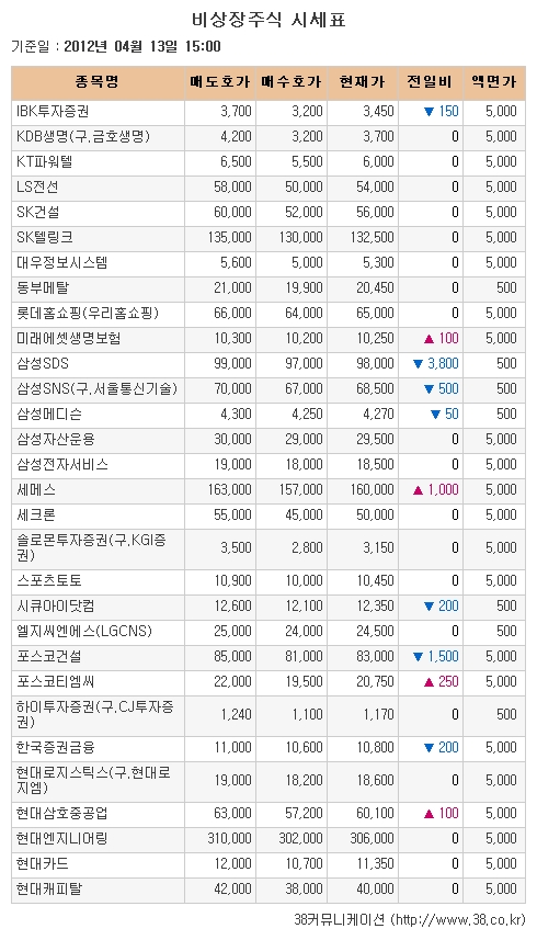 [아시아경제 김영식 기자]비상장주식 시장이 13일 나흘 연속 하락했다.IPO(기업공개) 관련 주로 치과용 임플란트 제조업체 덴티움이 6800원(-40.09%)으로 상장심사 미승인에 따른 실망 매물에 폭락했다. 정전기 제거 장치 제조업체 선재하이테크가 1만3200원(-4.69%)으로 사흘 연속 하락했으며, 휴대폰용 카메라 렌즈 제조업체 디지털옵틱과 코팅기 외 특수목적 장비 제조업체 피엔티가 동반 약세를 나타냈다.삼성전자 관련주는 반도체 세정장비 제조업체인 세메스가 16만원(+0.63%)으로 하락 이후 4주일 만에 반등했다. ICT(정보통신기술) 서비스기업 삼성SDS와 홈 네트워크 전문기업 삼성SNS가 각각 9만8000원(-3.73%), 6만8500원(-0.72%)을 기록했고 삼성SDS가 낙폭을 키우며 52주 최저가를 경신했다.또한 정보 보안솔루션업체 시큐아이닷컴이 1만2350원(-1.59%)으로 상승 하루 만에 반락했고, 초음파 진단기 전문기업 삼성메디슨이 4270원(-1.16%)으로 사흘 연속 내렸다.금융 관련주는 생명보험사 미래에셋생명이 1만250원(+0.99%)으로 하락 후 이틀 만에 반등했지만, 증권담보 대출업체 한국증권금융과 증권사 IBK투자증권이 각각 1만800원(-1.82%), 3450원(-1.82%)으로 내렸다.제조업 관련주는 항응혈제 개발 제조업체 레고켐바이오사이언스와 태양광 발전용 폴리실리콘 제조업체 한국실리콘이 각각 1만1100원(+1.83%), 6500원(+2.36%)을 기록했다. 레고켐바이오사이언스가 강세를 지속하며 신고가 행진을 이어갔고, 디스플레이 장비 생산업체 에프엔에스테크가 8450원(-1.74%)으로 하루 쉬고 다시 내려 최저가를 경신했다.그 밖에 티코아 및 금형생산업체 포스코티엠씨와 토목 공학용 통합솔루션 전문기업 마이다스아이티가 각각 2만750원(+1.22%), 2만500원(+1.23%)을 기록했다. 마이다스아이티는 상승세가 지속되며 사흘만에 연중 최고가를 재경신했다. 종합 건설사 포스코건설은 8만3000원(-1.78%)으로 하락하며 장을 마감했다.자료제공 :