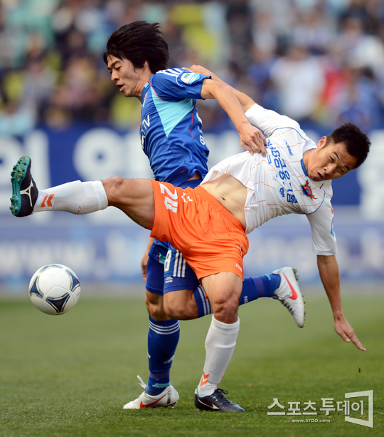 [수원=스포츠투데이 정재훈 기자] 14일 오후 수원월드컵경기장에서 열린 '현대 오일뱅크 K리그 2012' 수원 삼성과 대구FC의 경기에서 하태균과 박종진이 몸싸움을 벌이고 있다.스포츠투데이 정재훈 사진기자 roze@<ⓒ아시아경제 & 재밌는 뉴스, 즐거운 하루 "스포츠투데이(stoo.com)">