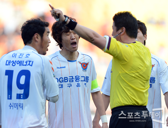 [수원=스포츠투데이 정재훈 기자] 수원 삼성이 14일 오후 수원월드컵경기장에서 열린 '현대 오일뱅크 K리그 2012' 대구FC와의 경기에서 스테보의 결승골로 1:0 승리, 홈 5연승을 달렸다. 조용태가 페널티 에어리어 안에서 넘어져 PK가 선언되자 대구 선수들이 항의하고 있다.스포츠투데이 정재훈 사진기자 roze@<ⓒ아시아경제 & 재밌는 뉴스, 즐거운 하루 "스포츠투데이(stoo.com)">