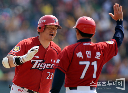 [스포츠투데이 정재훈 기자] 15일 오후 잠실야구장에서 열린 '2012 팔도 프로야구' LG트윈스와 KIA 타이거즈의 경기에서 최희섭이 1회초 2점홈런을 때려낸 뒤 백인호 코치와 하이파이브하고 있다.스포츠투데이 정재훈 사진기자 roze@<ⓒ아시아경제 & 재밌는 뉴스, 즐거운 하루 "스포츠투데이(stoo.com)">