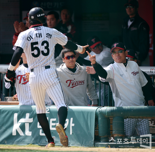 [스포츠투데이 정재훈 기자] 15일 오후 잠실야구장에서 열린 '2012 팔도 프로야구' LG트윈스와 KIA 타이거즈의 경기 1회말 박용택의 희생플라이에 홈을 밟는 이대형.스포츠투데이 정재훈 사진기자 roze@<ⓒ아시아경제 & 재밌는 뉴스, 즐거운 하루 "스포츠투데이(stoo.com)">
