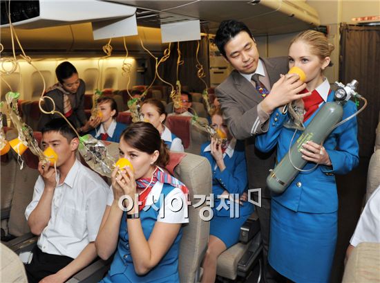[아시아경제 조슬기나 기자]16일 서울시 강서구 오쇠동 아시아나타운 교육훈련동에서 러시아 블라디보스톡항공 승무원이 아시아나 승무원으로부터 기내 감압 시 산소마스크 착용 훈련을 받고 있다.조슬기나 기자 seul@<ⓒ세계를 보는 창 경제를 보는 눈, 아시아경제(www.asiae.co.kr) 무단전재 배포금지>