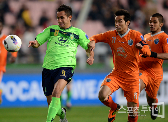 [전주=스포츠투데이 정재훈 기자] 17일 오후 전주월드컵경기장에서 열린 '2012 AFC 챔피언스리그' 전북 현대와 부리람의 경기에서 에닝요가 상대선수와 몸싸움을 벌이고 있다.스포츠투데이 정재훈 사진기자 roze@<ⓒ아시아경제 & 재밌는 뉴스, 즐거운 하루 "스포츠투데이(stoo.com)">
