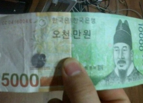 [아시아경제 장인서 기자] '나 5천만원 있음'이라는 제목의 사진 게시물이 온라인상에서 화제다. 최근 온라인상에 '폭소만발, 나 5천만원 있음'이라는 제목으로 공개된 사진에는 5000원짜리를 반으로 접은 뒤 만원짜리 지폐와 겹쳐 놓은 모습이 담겨 있다. 색상의 차이가 있긴 하지만 돈의 단위가 적혀있는 부분이 맞아 떨어지면서 마치 '오천만원'이라는 새로운 지폐가 만들어진 듯하다. 의외로 쉬운(?) 오천만원짜리 지폐 만드는 방법에 대해 네티즌들은 "진짠가 했다", "어이 없지만 웃었다", "당황스럽네요" 등 다양한 반응을 보였다. 장인서 기자 en1302@<ⓒ세계를 보는 창 경제를 보는 눈, 아시아경제(www.asiae.co.kr) 무단전재 배포금지>