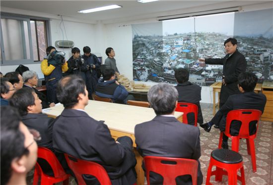 김영배 성북구청장(오른쪽)이 지난달 23일 성북구 마을기업인 동네목수 사무실에서 기초자치단체장 등 목민관클럽 정기포럼 참석자들에게 삼선동 장수마을에서 펼쳐지고 있는 주민중심의 마을만들기에 관해 설명하고 있다.<br />