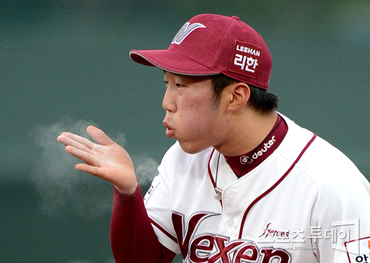 [스포츠투데이 정재훈 기자] 20일 오후 목동야구장에서 열린 '2012 팔도 프로야구' 넥센 히어로즈와 두산 베어스의 경기에서 넥센 선발투수 문성현이 손에 묻은 로진 가루를 불고 있다.스포츠투데이 정재훈 사진기자 roze@<ⓒ아시아경제 & 재밌는 뉴스, 즐거운 하루 "스포츠투데이(stoo.com)">