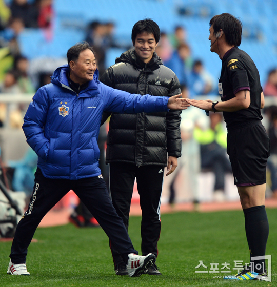 [인천=스포츠투데이 정재훈 기자] 울산 현대가 22일 오후 인천축구전용경기장에서 열린 '현대 오일뱅크 K리그 2012' 인천 유나이티드와의 경기에서 후반 인저리타임에 터진 마라냥의 결승골로 1:0 승리를 거뒀다. 판정에 울산 코치들의 고성이 들리자 달려온 주심을 말리는 김호곤 감독.스포츠투데이 정재훈 사진기자 roze@<ⓒ아시아경제 & 재밌는 뉴스, 즐거운 하루 "스포츠투데이(stoo.com)">