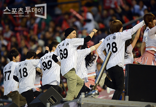 [스포츠투데이 정재훈 기자] 26일 오후 잠실야구장에서 열린 '2012 팔도 프로야구' LG 트윈스와 넥센 히어로즈의 경기. 아이돌그룹 틴탑이 LG 응원석 단상에서 응원을 펼치고 있다.스포츠투데이 정재훈 사진기자 roze@<ⓒ아시아경제 & 재밌는 뉴스, 즐거운 하루 "스포츠투데이(stoo.com)">