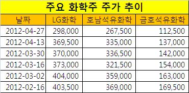 수요 감소 영업익 뚝52주 신저가 내달려신사업 등 개별호재로하반기 반등징후 기대[아시아경제 지선호 기자] 화학주가 연일 52주 신저가를 향해 내달리고 있다. 단기 낙폭이 크다 보니 저가매수 기회라는 전문가들의 조언도 잇따르지만 바닥 밑의 지하실처럼 추가하락하는 양상이다. 급락의 가장 큰 원인은 중국 수요 부진에 따른 실적 악화다. 전문가들은 하반기에는 뚜렷한 반등의 징후를 기대할 수 있을 것이라고 한다. 문제는 주가 반등 시점이다. 30일 한국거래소에 따르면 금호석유화학은 전거래일인 지난 27일 52주 신저가를 경신했다. 금호석유화학은 27일 종가기준으로 전일보다 5000원(4.26%) 하락한 11만2500원에 장을 마감했다. 같은 날 LG화학과 호남석유화학도 각각 2.45%, 3.95% 하락했다. 두 종목 역시 52주 신저가를 얼마 남겨두지 않고 있다. 대형 화학주의 하락은 표면적으로는 실적 악화 요인이 작용했기 때문이다. 지난 19일 올해 1분기 실적을 발표한 LG화학은 '어닝쇼크'에 해당하는 결과를 내놨다. 영업이익이 전년 같은 기간보다 45% 감소한 4595억원을 기록했고, 순이익도 42% 줄어든 3809억원에 그쳤다. 다음날인 20일 실적을 발표한 호남석유화학도 영업이익과 당기순이익이 각각 2191억원(-62.36%), 1785억원(-59.84%)에 그쳤다. 이보다 먼저 1분기 실적을 발표한 금호석유화학도 영업이익과 당기순이익이 전년동기 대비 54.8%, 50.4% 감소했다. 화학주의 저조한 1분기 실적은 중국 수요가 감소한 영향이 가장 크다는 분석이다. 화학업종의 성장이 중국 성장과 민감하게 이어져 왔지만 최근 중국 경제의 주춤한 성장률과 '필수품·일용품·상품(Commodity)'을 벗어나는 움직임이 화학업종의 약세의 배경이다. 이승우 KDB대우증권 애널리스트는 "중국의 성장률이 낮아지고 있다는 것에 근본적인 원인이 있다"고 설명했다. 화학주들의 실적 개선은 2분기를 거쳐 하반기에 이르러서야 본격적인 반등이 시작될 것으로 보인다. 이희철 하이투자증권 애널리스트는 "올해 2분기에도 중국의 수요회복이 지연되면서 본격적인 업황 회복을 기대하기 어렵다는 점에서 당분간 뚜렷한 실적 모멘텀을 기대하기는 어려울 전망"이라고 밝혔다. 그는 "역내 경쟁사와 비교할 때 주가 낙폭도 심화되고 있다는 점에서 중국의 지준율 인하, 유가 안정에 따른 제품마진 반등 등 긍정적인 시그널이 나올 경우 단기 대응은 가능할 것"이라고 전망했다. 실적개선 시점을 2분기로 보는 전문가도 있다. 황유식 메리츠종금증권 애널리스트는 "중국의 수요 정체 및 원재료 가격 상승으로 3월 실적은 저조한 것으로 추정되지만 4월 이후 주요 소비처인 IT제품의 출하량 증가로 합성수지 제품의 가동률이 상승할 것"이라고 내다봤다. 각 회사의 개별 호재도 눈여겨 볼 필요가 있다며 저가매수에 무게를 두는 의견도 있다. 예컨대 LG화학 주가가 프리미엄을 받은 이유는 전기차용 배터리 사업 등 신사업의 성장성에 대한 기대 때문이었지만, GM '볼트' 판매 부진 등으로 제동이 걸렸다. 역으로 GM 전기차가 살아나면 LG화학에 대한 매도세가 매수세로 바뀔 수 있다는 얘기다.이응주 신한금융투자 애널리스트는 "LG화학의 신사업은 이제 출발선에 섰다고 해도 과언이 아니다"라며 "GM '볼트'의 판매량이 3월부터 증가하고 있고, 친환경차 출시로 중대형 배터리 부문의 매출액은 재차 높은 성장세를 구가할 전망"이라고 말했다. 호남석유화학도 케이피케미칼의 합병에 대한 기대감이 무르익고 있다. 상법 개정으로 케이피케미칼과 합병이 재추진 될 전망이다. 이응주 애널리스트는 "2009년 합병 추진 시기보다 합병조건이 호남석유 쪽에 더 유리해졌고, 합병절차도 수월해졌기 때문이다"라고 설명했다.