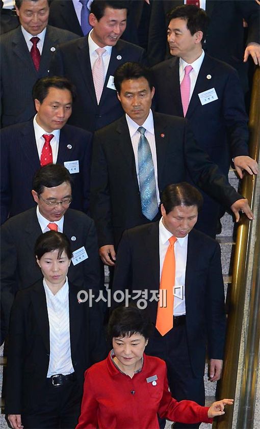 [아시아경제 양지웅 기자] 30일 오후 서울 여의도 국회 헌정기념관에서 열린 새누리당 19대 국회의원 당선자 대회에서 박근혜 비상대책위원장 및 참가자들이 계단을 내려가고 있다. 양지웅 기자 yangdoo@<ⓒ세계를 보는 창 경제를 보는 눈, 아시아경제(www.asiae.co.kr) 무단전재 배포금지>