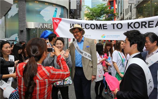 [아시아경제 조용준 기자]한국관광공사는 3일 일본 골든위크와 중국 노동절을 맞아 대거 한국을 방문한 외국인 관광객을 위해 명동에서 손님맞이 행사를 실시한 가운데 이참 한국관광공사 사장이 외국인 관광객들과 기념사진을 찍고 있다. <ⓒ세계를 보는 창 경제를 보는 눈, 아시아경제(www.asiae.co.kr) 무단전재 배포금지>