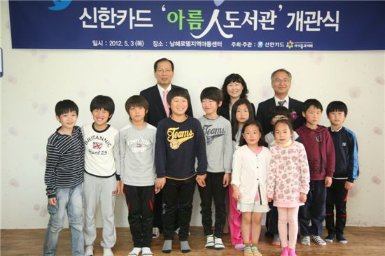 신한카드는 경상남도 남해군 설천면 덕신리에 위치한 로뎀지역아동센터에서 '아름인 도서관' 개관을 가졌다고 3일 밝혔다. 신한카드는 소외지역 아동들이 독서를 통해 보다 나은 삶을 살아갈 수 있는 토대를 마련한다는 취지로 아름인 도서관을 운영하고 있다. 지난 2010년 서울 관악구 참좋은지역아동센터에 1호 도서관을 개관한 이후 이번이 234번째다. 사진은 이재우 사장(뒷줄 왼쪽 첫번째)와 아이들과미래 박두준 사무총장(뒷줄 오른쪽 첫번째), 고지현 남해로뎀지역아동센터장(뒷줄 가운데)이경남 남해군 설천면에 위치한 남해로뎀지역아동센터 아름人도서관 개관식에서 기념촬영을 하는 모습.김은별 기자 silverstar@<ⓒ세계를 보는 창 경제를 보는 눈, 아시아경제(www.asiae.co.kr) 무단전재 배포금지>