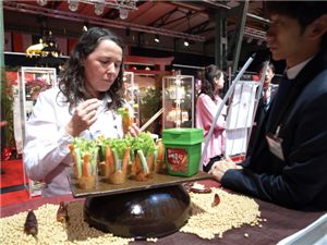 독일 바이어가 샘표가 쌈장을 소스로 이용해 만든 음식을 맛보고 있다.