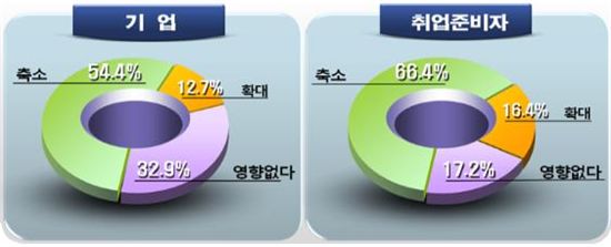 [아시아경제 박민규 기자] 대학 취업준비생 3명 중 2명은 정년연장 및 재고용 등 고용연장 조치가 청년 일자리 감소로 이어질 것으로 보는 것으로 나타났다. 이에 따라 향후 세대 간 일자리 갈등이 우려된다는 분석이다. 또한 취업준비생 5명 중 4명은 현재의 정치·경제적 상황에 대해 불만을 갖고 있는 것으로 조사됐다. 불만의 가장 큰 원인은 취업난 심화와 기성 정치권의 신뢰 상실이었다.한국경영자총협회는 316개 기업의 인사담당자와 전국 대학 취업준비생 743명을 대상으로 '청년실업과 세대 간 일자리 갈등에 관한 인식조사'를 실시한 결과 기업의 54.4%와 취업준비생의 66.4%가 고용연장 조치가 채용과 취업에 악영향을 끼칠 것이라 우려하는 것으로 나타났다고 7일 밝혔다. 특히 대학 취업준비생들은 대기업·공공기관 등 청년층 선호 일자리를 중심으로 세대 간 일자리 갈등현상이 심각할 것으로 내다봤다. 취업준비생의 69.1%는 고용연장 조치에 따른 세대 간 일자리 갈등이 공공기관 및 대기업 등 소위 '괜찮은 일자리'에 집중될 것으로 인식하고 있었다. 기업 인사담당자들도 대기업(70.7%)이 중소기업(36.8%)보다 정년연장에 따른 신규채용 감소 우려가 더 컸다.조사대상 기업의 44.3%는 현재 근로자 고령화가 심각한 수준이라고 판단했다. 근로자 고령화의 주요 원인으로는 '정년보장 등으로 인한 인력조정의 어려움'(42.9%), '연공서열형 임금 체계로 인해 신규채용 여력 감소'(18.6%), '사업 부진 및 정체'(15.7%) 등을 꼽았다. 세대 간 일자리 갈등을 해소하기 위해서는 '근속연수에 비례하는 중·고령자 고임금체계 개선'(40.5%), '고용형태 활용에 대한 규제 완화'(18.4%), '임금·근로시간 조정 등을 통한 일자리나누기 활용'(17.1%) 등이 필요하다고 지적했다.대학 취업준비생들은 현재 정치·경제에 큰 불만을 갖고 있으며 이는 상당부분 취업난과 기성 정치권의 신뢰 상실에 따른 것으로 조사됐다. 최근 정치·경제 현실에 대한 만족도를 묻는 질문에 78.7%가 불만족스럽다고 응답했다. 만족하지 못하는 이유로는 '취업난 심화'가 32.3%로 가장 높았고 '기성 정치권의 신뢰 상실' 28.4%, '빈부격차 심화' 20.0%, '높은 등록금' 12.8% 순으로 나타났다.▲청년층 취업난의 원인에 대한 기업과 취업준비자 간 의식 비교