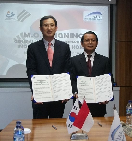 문재우 손해보험협회장(왼쪽)이 코넬리우스 시만준탁 인도네시아 보험협회장과 업무협력 양해각서(MOU)를 체결하고 포즈를 취하고 있다.