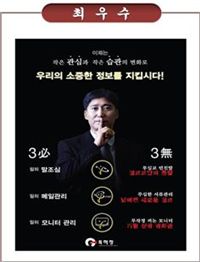 [아시아경제 왕성상 기자] 특허청(청장 김호원)이 직원들의 특허보안에 대한 중요성을 높이기 위해 연 ‘2012년 보안표어·포스터 경연대회’에서 이다나 심사관(포스터)과 안영웅 사무관(표어)이 최우수상을 받았다. 9일 특허청에 따르면 대전청사에 있는 본청과 산하기관, 외주용역업체 등 34개 기관·업체가 참여한 경연대회엔 200여 작품이 출품돼 지난 3일 오후 최종심사가 이뤄졌다.심사 결과 부문별(보안표어 부문·보안포스터 부문)로 최우수상 및 우수상 각 1명, 장려상 각 2명이 영예를 안았다.포스터부문의 최우수상은 보안에서 꼭 필요한 요소를 ‘3必’로 표현하고 절대로 해선 안 되는 요소를 ‘3無’로 나타내 관심을 끈 이다나 정보통신심사국 심사관’이 받았다.2012년 '특허보안 포스터, 표어' 경연대회 우수작