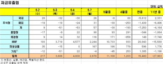[아시아경제 김영식 기자]국내주식형펀드가 3일만에 순유입으로 전환했다. 해외주식형펀드도 8일만에 순유입을 기록했다.8일 금융투자협회에 따르면 지난 7일 기준으로 상장지수펀드(ETF)를 제외한 국내주식형펀드에서 약 263억원이 유입됐다. 해외주식형펀드는 약 309억원이 들어왔다.채권형펀드에서는 약 1157억원이 유입됐고 머니마켓펀드(MMF)에서는 약 2조2443억원이 들어왔다.전체 주식형펀드의 설정액은 전일대비 약 874억원 감소한 96조9811억원을 나타냈다. 설정액과 운용수익을 합한 주식형펀드의 순자산 총액은 전일보다 1조4607억원 감소한 86조2877억원으로 집계됐다.채권형 펀드와 MMF 등을 합한 전체 펀드 설정액은 전일보다 약 2조5171억원 증가한 315조8025억원이었고 전체 펀드의 순자산총액은 약 8278억원 늘어난 303조5107억원이었다.