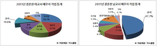 2위는 공사·공무원(26.6%), 3위 전문직(18.5%) 순으로 이어졌다. 남교사와 결혼한 여교사는 10.6%에 그쳤다. 반면에 남교사의 경우 절반가량인 47.7%가 여교사와 결혼한 것으로 나타났다.2위로는 공무원·공사(22.0%), 3위는 중견·중소기업(14.1%) 순으로 이어져 여교사의 배우자 직업 통계와 차이가 있었다.남교사 2명 중 한 명은 여교사와 결혼하지만, 여교사는 10명 중 1명만 남교사와 결혼하는 이유에 대해 닥스클럽 관계자는 “여교사의 숫자가 절대적으로 많기 때문”이라고 설명했다. 그는 “남교사는 숫자가 많지 않기 때문에 비율로만 놓고 보면 2명 중 1명이 교사와 결혼할 정도로 교사와의 결혼 성사율이 높은 것”이라고 언급했다.또 “동일 직업의 경우 업무 환경이 비슷하고 업무 문화가 유사해 서로를 이해하는 데 큰 도움이 된다”면서 “교사의 경우 공무원과 마찬가지로 동종업계에 대한 선호가 높다”고 덧붙였다.닥스클럽은 직업의 안정성, 단정하고 지적인 이미지와 자녀 교육에 대한 기대감, 상대적인 시간적 여유 등으로 교사에 대한 선호가 높기 때문에 한동안 안정적인 직업군은 계속 인기를 끌 것이라고 내다봤다.오주연 기자 moon170@<ⓒ세계를 보는 창 경제를 보는 눈, 아시아경제(www.asiae.co.kr) 무단전재 배포금지>