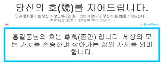 [아시아경제 박충훈 기자] '당신의 호(號)를 지어드립니다(kr.shindanmaker.com/224013)'라는 웹 게시물이 네티즌 사이에 화제를 낳고 있다. 이 게시물은 "멋과 문화를 아는 당신, 지성인이라면 호가 있어야 한다"는 그럴듯한 말로 '호 짓기'를 권유한다. 사이트에 들어가 이름만 기입하면 두 글자의 한자로 된 호가 간단히 완성된다. 호 자체만 놓고 보면 고개가 갸웃거려진다. 하나같이 '쾌변(快辯)', '삽질(揷質)', '망할(望轄)' 등 이상한 이름 뿐이다. 하지만 그 뜻풀이에는 감탄이 절로 나온다. '쾌변(快辯)'은 '통쾌하게 사리를 판별할줄 아는 사람이 되라는 의미', '삽질(揷質)'은 '아침의 의미를 새기며 늘 초심을 잃지 말라는 뜻', '망할(望轄)'은 "바라는 것을 다스림, 욕망을 제어할 수 있는 절제된 삶을 의미한다"는 식이다. 기자 이름을 직접 적어 넣으니 "당신의 호는 每讀(매독) 입니다. 언제나 책을 손에서 놓지않는 것이 참된 배움의 자세입니다"라는 다소 황당한 호와 뜻풀이가 나왔다. 이명박 대통령의 이름을 넣어보니 '존나(尊儺)'라는 호가 만들어졌다. '존경받기 위해선 법도를 지켜야 한다는 의미'다.박충훈 기자 parkjovi@<ⓒ세계를 보는 창 경제를 보는 눈, 아시아경제(www.asiae.co.kr) 무단전재 배포금지>