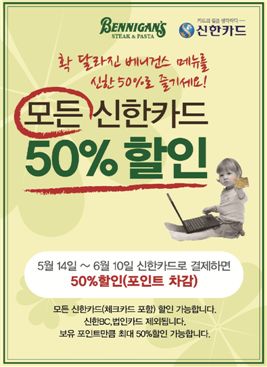 [아시아경제 오주연 기자]패밀리레스토랑 베니건스는 오는 14일부터 6월10일까지 4주 동안 신한카드로 결제 시 최대 50%까지 할인해주는 이벤트를 진행한다.베니건스는 11일 종류에 관계없이 모든 신한카드 고객 대상으로 파스타, 피자 등 최근 새로 선보인 신메뉴를 포함한 다양한 베니건스 메뉴를 할인 판매한다고 밝혔다. 특히 마이신한포인트로 결제하면 최대 50%까지 할인을 받을 수 있다. 이번 행사는 파스타, 피자 등 최근 새로 선보인 신메뉴를 포함한 다양한 베니건스 메뉴들을 더욱 많은 고객들이 경험하고 즐길 수 있도록 마련했다. 이 외에도 현재 전국 매장에서 모든 홈메이드 파스타를 9900원에 맛볼 수 있는 ‘9900원 파스타 축제’가 펼쳐지고 있어 신한카드 50%행사와 함께 이용한다면 더욱 알뜰한 식사가 가능하다. (제휴할인 불가) 오주연 기자 moon170@<ⓒ세계를 보는 창 경제를 보는 눈, 아시아경제(www.asiae.co.kr) 무단전재 배포금지>