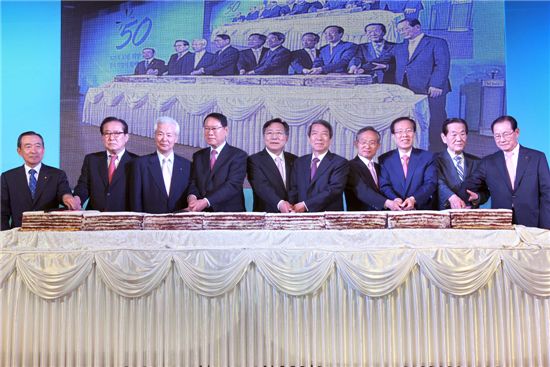 [아시아경제 김대섭 기자] 14일 서울 여의도 중소기업중앙회에서 열린 중기중앙회 창립 50주년 기념식에 참석한 관계자들이 케이크 커팅식을 하면서 활짝 웃고 있다. 이날 행사에는 50년 사사(社史) 및 타임캡슐 봉인식, 중소기업계 공로자 감사패 및 공로패 전달식 등이 진행됐다.김대섭 기자 joas11@<ⓒ세계를 보는 창 경제를 보는 눈, 아시아경제(www.asiae.co.kr) 무단전재 배포금지>