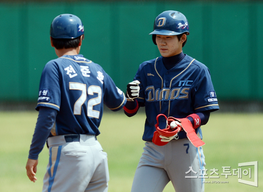 [성남=스포츠투데이 정재훈 기자] 15일 오후 국군체육부대 상무 야구장에서 열린 '2012 퓨쳐스리그' 상무 야구단과 NC 다이노스의 경기. 번트를 댄 후 전력질주해 1루 진루에 성공한 박민우가 전준호 코치와 주먹을 맞대고 있다.스포츠투데이 정재훈 사진기자 roze@<ⓒ아시아경제 & 재밌는 뉴스, 즐거운 하루 "스포츠투데이(stoo.com)">