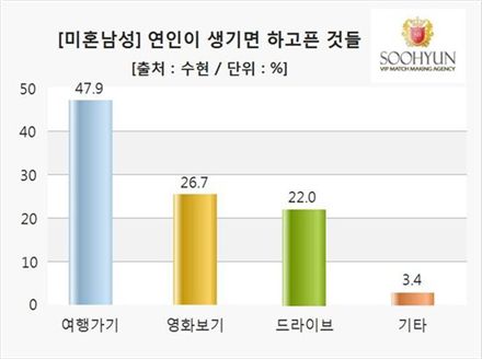 [아시아경제 오주연 기자] 싱글 남녀들은 애인이 생기면 무엇을 하고 싶을까. 영화관에 남성끼리 갔던 미혼남성이라면 연인과 함께 영화를 보러 가고 싶어 할 테고, 주말마다 여성 친구들끼리 커피숍에서 수다만 나눠왔던 미혼여성이라면 연인과 교외로 드라이브를 가고 싶어 할 터.결혼정보회사 수현은 자사 회원(남 382명, 여 414명)을 대상으로 지난 1일부터 15일까지 '연인이 생기면 함께 하고픈 그것?'이라는 주제로 설문을 실시했다.이 질문에 대해 여성, 남성 모두 ‘여행가기(여 39.9%, 남 47.9%)’를 1위로 꼽아 남성뿐만이 아니라 여성들도 연인과 함께 여행을 가고 싶어 하는 경향이 큰 것으로 나타났다.