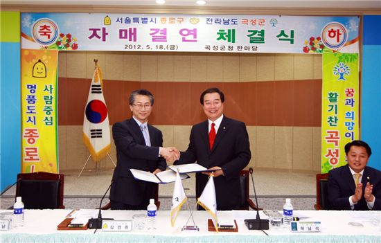 김영종 종로구청장(왼쪽)과 허남석 곡성군수가 자매결연 협정서에 서명한 후 악수하고 있다.<br />