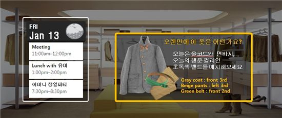 [아시아경제 진희정 기자]현대건설이 스마트폰 등 최신 IT 기기와 연동해 수납물의 위치와 수량을 확인할 수 있는 '똑똑한 수납정보 관리 시스템'을 개발해 화제다. 현대건설은 디지털 가전 등 생활용품의 효율적인 수납을 위해 박영순 디자인연구소와 함께 '드레스룸 정보시스템'과 '말하는 수납장'을 개발했다고 21일 밝혔다.이번에 개발한 '드레스룸 정보시스템'은 사용자의 음성 인식을 통해 원하는 의상이 수납장의 어디에 있는지 위치를 표시해 주고, 날씨에 맞는 추천 의상을 보여준다. 또 제품 구입일·세탁방법 등과 같은 의상의 기본적인 정보 저장도 가능하다.