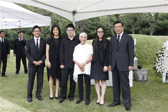 고 박성용 금호아시아나그룹 명예회장의 7주기 추모식이 23일 경기도 화성시 팔탄면 기천리 선영에서 열렸다. 사진 오른쪽부터 박삼구 금호아시아나그룹 회장, 피아니스트 손열음, 고인의 부인 마거릿 클라크 박 여사, 바이올리니스트 권혁주, 고인의 딸 박미영, 박세창 금호타이어 부사장<br /> <br />