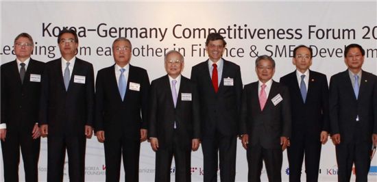 [아시아경제 오현길 기자]국가경쟁력강화위원회(위원장 손경식)는 24일 삼성동 그랜드인터컨티넨탈호텔에서 ‘한-독 경쟁력 포럼’을 개최했다.이번 포럼은 글로벌 경제위기 속에서도 경쟁력 있는 중소기업을 바탕으로 제조업과 금융업이 조화를 이루고 있는 독일경제로부터 시사점과 교훈을 얻기 위해 마련됐다.왼쪽부터 후버투스 배스(Hubertus Vath) 프랑크푸르트 메인파이낸스 이사, 김우상 한국국제교류재단 이사장, 김종인 前청와대 경제수석, 손경식 국가경쟁력강화위원회 위원장, 한스-율리히 자이트(Hans-Ulrich Seidt) 주한독일대사, 권태신 국가경쟁력강화위원회 부위원장, 추경호 금융위원회 부위원장, 송종호 중소기업청장
