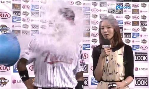 [아시아경제 나석윤 기자] LG트윈스 임찬규 선수의 '귀여운 하극상'이 화제가 되고 있다.지난 24일 열린 '2012 팔도 프로야구' LG와 넥센의 경기 후 가진 수훈선수 인터뷰에서 임찬규가 선배 이진영에게 물벼락을 날린 것. 임찬규는 KBSN 정인영 아나운서와 인터뷰를 가지던 이진영 옆으로 다가가 벼락같이 양동이에 담은 물을 뿌렸다. 이에 이진영은 물론이고 옆에 있던 정 아나운서까지 물벼락을 맞아 흠뻑 젖고 말았다.이에 정 아나운서는 "괜찮으세요? 어떤 선수인지 확인하셨나요?"라고 물었고 이진영은 "네, 확인했습니다. 임찬규 선수였는데 보복하겠습니다"라고 전했다.또 "어떻게 보복하겠느냐?"는 정 아나운서의 질문에 이진영은 "(제가) 선배니까 강압적으로 배트를 사용하겠습니다"라고 말해 큰 웃음을 선사하기도 했다. 한편 이날 경기는 넥센이 팀 창단 후 처음으로 9연승에 도전하는 경기였다. LG도 넥센전 4연패의 사슬을 끊어야 했기 때문에 중요하긴 마찬가지. 경기에서는 이진영이 4타수 3안타 2타점으로 맹타를 휘두른 LG가 5대3으로 넥센을 꺾었다. 나석윤 기자 seokyun1986@<ⓒ세계를 보는 창 경제를 보는 눈, 아시아경제(www.asiae.co.kr) 무단전재 배포금지>