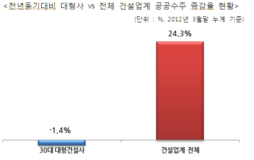 지난 1분기 국내 공공건설공사 발주물량이 큰 폭 늘었는데도 대형건설사의 수주물량은 오히려 줄어든 것으로 나타나 역차별 지적이 나오고 있다.25일 한국건설경영협회에 따르면 지난 1분기 국내 공공건설공사 발주 물량은 지난해 같은 기간보다 24.3% 급증했다. 하지만 30대 대형 건설사의 수주실적은 같은 기간 1.4% 감소해 대조를 이뤘다. 보통 공공건설입찰에서는 지역업체 또는 중소건설사 보호에 집중된 정부의 입찰정책으로 대형 건설사들이 사실상 입찰에서 배제되는 등 역차별을 받고 있기 때문으로 협회는 분석했다. 이 같은 정부정책은 지역중소건설사가 난립과 시장질서 교란으로 이어질 수 있어 대형건설사에 대한 역차별적인 정책을 재검토할 필요가 있다는 게 협회의 주장이다. 한 대형건설사 관계자는 “최근 우리 경제가 FTA 확대 등 세계경제의 글로벌화 정책을 확대하는 마당에 건설산업도 선진국 수준으로 도약하려면 보호·육성 위주의 정책에서 경쟁과 효율을 기본으로 하는 정책적 방향 전환이 필요하다”고 말했다. 김창익 기자 window@<ⓒ세계를 보는 창 경제를 보는 눈, 아시아경제(www.asiae.co.kr) 무단전재 배포금지>