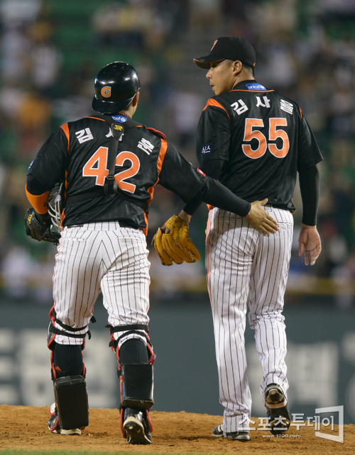 [스포츠투데이 정재훈 기자] 롯데 자이언츠가 27일 오후 잠실야구장에서 열린 '2012 팔도 프로야구' 두산 베어스와의 경기에서 7:1 승리를 거뒀다. 승리 기쁨을 나누는 김사율과 김사훈.스포츠투데이 정재훈 사진기자 roze@<ⓒ아시아경제 & 재밌는 뉴스, 즐거운 하루 "스포츠투데이(stoo.com)">