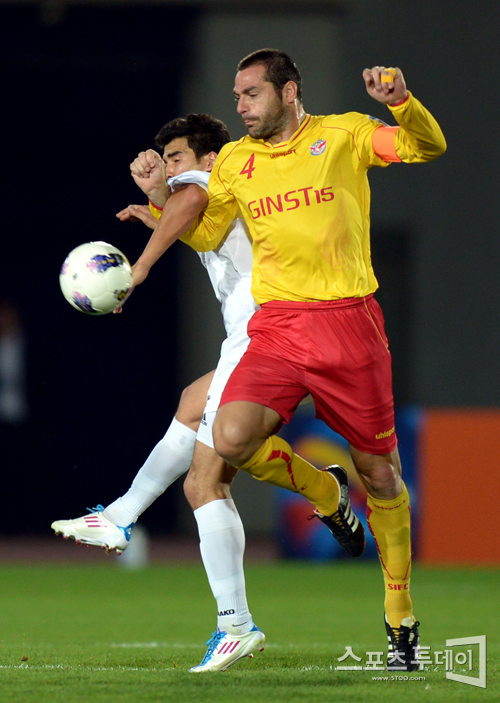 [성남=스포츠투데이 정재훈 기자] 29일 오후 탄천종합운동장에서 열린 '2012 AFC 챔피언스리그' 성남 일화와 분요드코르의 16강전에서 사샤가 상대 공격수와 몸싸움을 벌이고 있다.스포츠투데이 정재훈 사진기자 roze@<ⓒ아시아경제 & 재밌는 뉴스, 즐거운 하루 "스포츠투데이(stoo.com)">