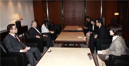 손경식 대한상공회의소 회장(왼쪽 가운데)은 31일 오후 대한상의회관에서 이시게 히로유키(石毛博行) 일본무역진흥기구 이사장(오른쪽 두번째)을 만나 양국경제현안 등 공동관심사에 관한 의견을 나누었다.