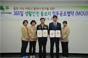 [아시아경제 이광호 기자]야쿠르트아줌마가 서울 구로소방서와 함께 독거노인 생활안전 돌보미로 나선다. 한국야쿠르트와 구로소방서는 31일 오전 '홀로 사는 노인 생활안전 돌보미 업무공조협약'을 체결했다고 밝혔다. 이번 협약식은 구로소방서가 진행 중인 '희망씨앗 좀도리·119-356일 안전사랑 배달' 운동의 효과를 극대화하기 위해 추진됐다. 구로소방서는 서울 구로구와 금천구에 거주하고 있는 77세 이상 독거노인 100명을 선정해 어르신들의 안전과 생사여부를 확인해 병원으로 이송하거나 관할구청 사회복지과에 통보하는 등 필요한 조치를 취하고 있다. 앞으로 구로소방서 관할 지역에서 활동 중인 야쿠르트아줌마들은 매일 담당 독거노인을 방문해 야쿠르트 1개씩을 전달하며, 특이사항이 발견되면 119로 신속하게 알리는 역할을 하게 된다. 장래춘 한국야쿠르트 지점장은 "야쿠르트아줌마가 사회 곳곳에서 펼친 활약상들이 알려지면서 공공기관에서 앞 다퉈 협력의 손을 내밀고 있다"며 "구로소방서와의 협약을 통해 야쿠르트아줌마가 더욱 긍지를 갖고 지역사회 안전에 기여할 수 있길 바란다"고 말했다.이광호 기자 kwang@<ⓒ세계를 보는 창 경제를 보는 눈, 아시아경제(www.asiae.co.kr) 무단전재 배포금지>