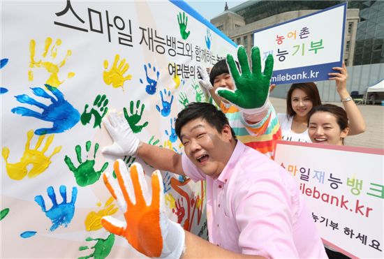 [아시아경제 조용준 기자]농림수산식품부는 '함께하는 우리 농어촌 운동'의 일원인 '스마일재능뱅크' 행사를 진행했다. 31일 서울 중구 태평로 서울광장에서 열린 '농어촌과 도시가 함께 미소짓는 스마일 재능 뱅크'행사에서 개그맨 유민상 등이 모델들과 손도장을 찍고 있다. <ⓒ세계를 보는 창 경제를 보는 눈, 아시아경제(www.asiae.co.kr) 무단전재 배포금지>