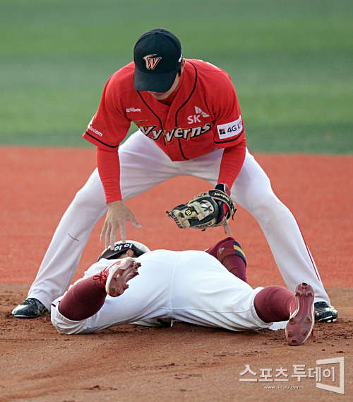 [스포츠투데이 정재훈 기자] 31일 오후 목동야구장에서 열린 '2012 팔도 프로야구' 넥센 히어로즈와 SK 와이번스의 경기 1회말 무사 1루 상황에서 서건창의 플라이아웃때 2루 진루에 성공하는 1루주자 정수성.스포츠투데이 정재훈 사진기자 roze@<ⓒ아시아경제 & 재밌는 뉴스, 즐거운 하루 "스포츠투데이(stoo.com)">