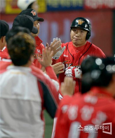 [스포츠투데이 정재훈 기자] 31일 오후 목동야구장에서 열린 '2012 팔도 프로야구' 넥센 히어로즈와 SK 와이번스의 경기 6회초 투런홈런을 터뜨린 이호준에 이어 박재홍이 백투백 홈런을 쳐낸 뒤 동료들의 환영을 받고 있다.스포츠투데이 정재훈 사진기자 roze@<ⓒ아시아경제 & 재밌는 뉴스, 즐거운 하루 "스포츠투데이(stoo.com)">