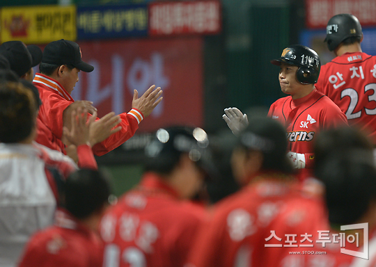 [스포츠투데이 정재훈 기자] 31일 오후 목동야구장에서 열린 '2012 팔도 프로야구' 넥센 히어로즈와 SK 와이번스의 경기 6회초 투런홈런을 터뜨린 이호준에 이어 박재홍이 백투백 홈런을 쳐낸 뒤 이만수 감독의 환영을 받고 있다.스포츠투데이 정재훈 사진기자 roze@<ⓒ아시아경제 & 재밌는 뉴스, 즐거운 하루 "스포츠투데이(stoo.com)">