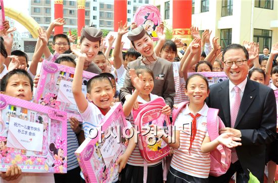 [아시아경제 조슬기나 기자]아시아나항공이 1일 중국 산둥성 웨이하이시 반월만소학교와 1지점1교 자매결연을 맺었다. 반월만소학교를 찾은 윤영두(앞줄 맨오른쪽) 아시아나항공 사장이 학생들에게 책가방을 선물하고 기념촬영을 하고 있다. 조슬기나 기자 seul@<ⓒ세계를 보는 창 경제를 보는 눈, 아시아경제(www.asiae.co.kr) 무단전재 배포금지>