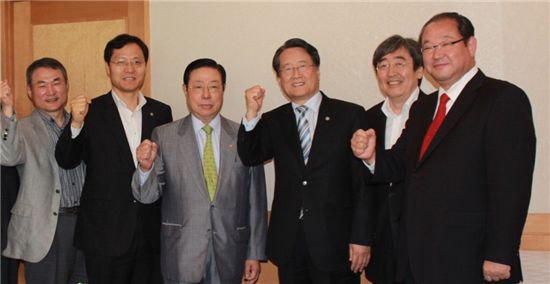 (왼쪽부터)이종태 퍼시스 대표, 정영태 동반위 사무총장, 윤봉수 회장, 유장희 위원장, 박진선 샘표식품 대표, 김상옥 유양디앤유 대표<br />